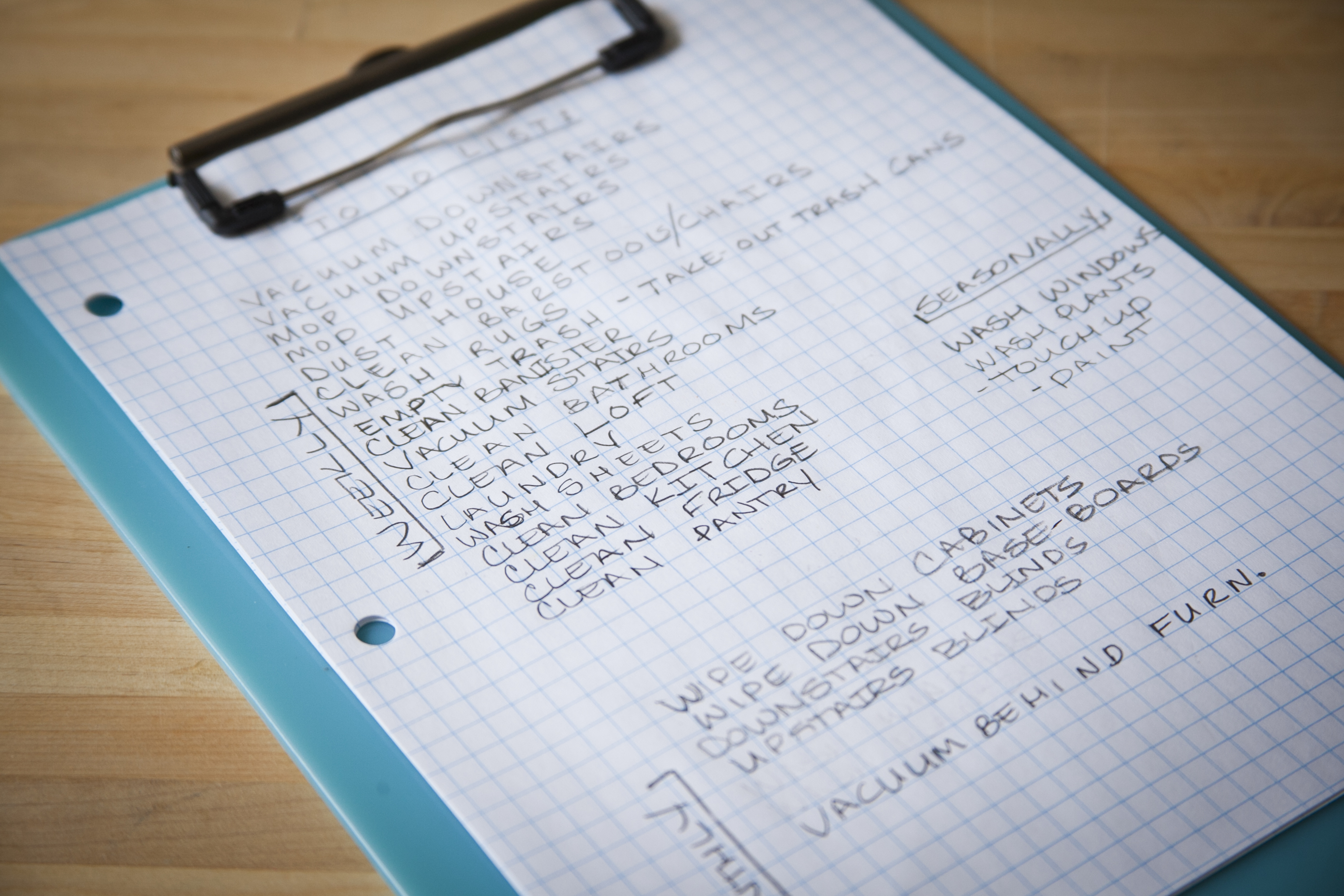 1. Grab a note pad and walk around your house. Make a list of all the jobs you have to do. Example: clean bathrooms, wash sheets, change the cat box, water the plants. Write down every job you want completed in your house for you to feel like it’s clean. For some this will be the basics. For me, it was a time to write everything I ever wanted to do as a job. I’m talking, clean the baseboards, dust the blinds, and vacuuming behind the furniture.